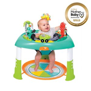 This transforming entertainer keeps little ones busy from tiny to toddler™. Little ones can spin 360 degrees while exploring 6 engaging interactive toys including light up buttons that activate music and sound effects. Features three height settings for growing tots. Once little one is walking, transform the entertainer into a stand-and-play activity table with three rolling animal pals. When playtime is done, the toys fold in and the legs fold under the table in seconds. Easy to store, take to grandma’s house, or simply move from room to room.