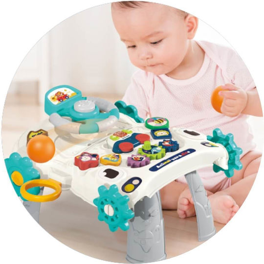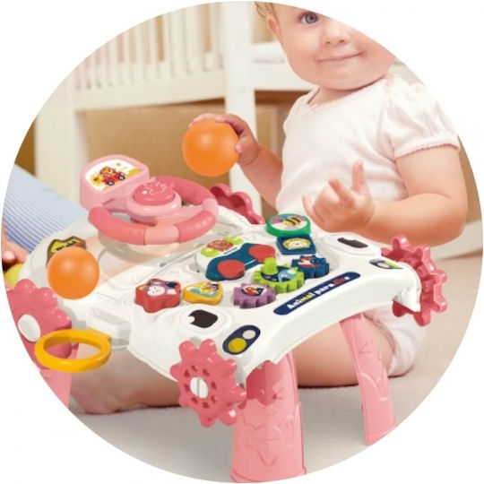 • Στο μπροστινό μέρος έχει τιμόνι, γρανάζια, τουβλάκια που παράγουν ήχους και χαρούμενα τραγούδια.