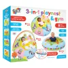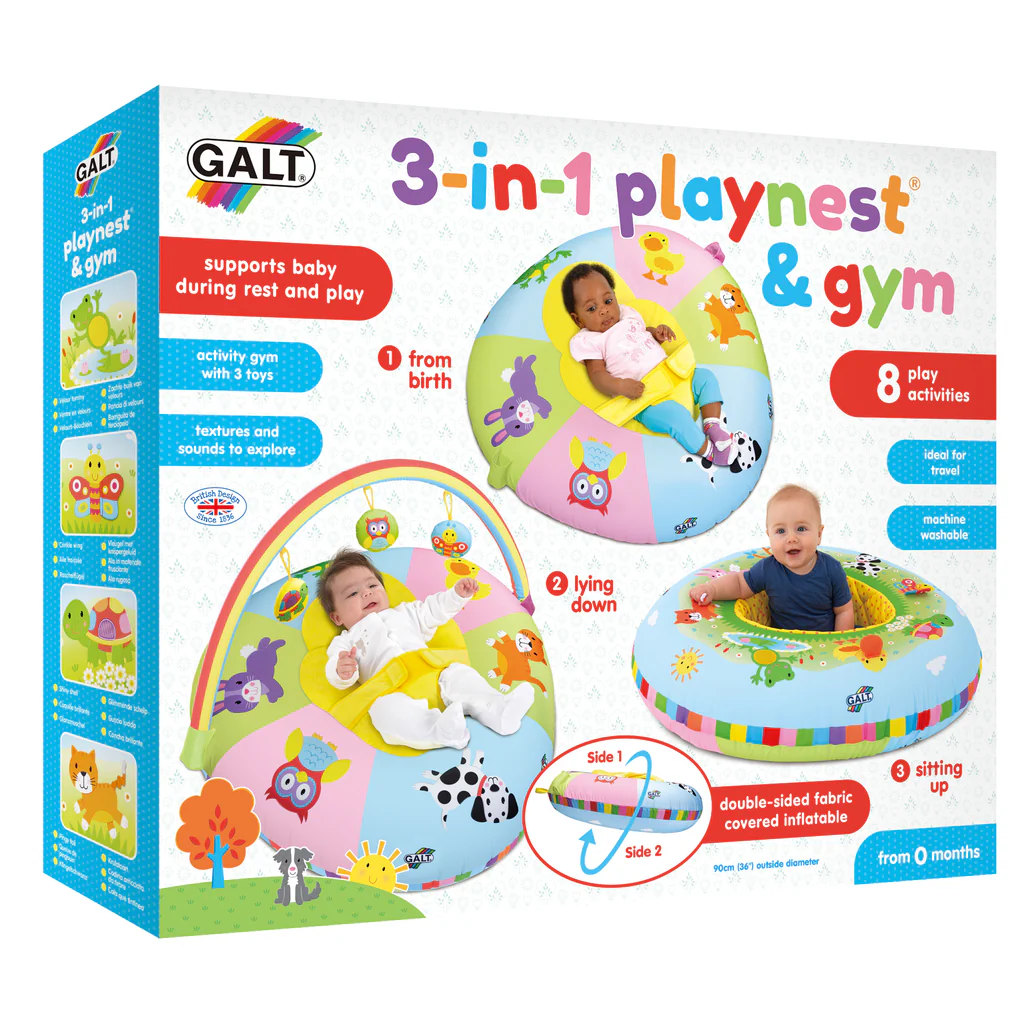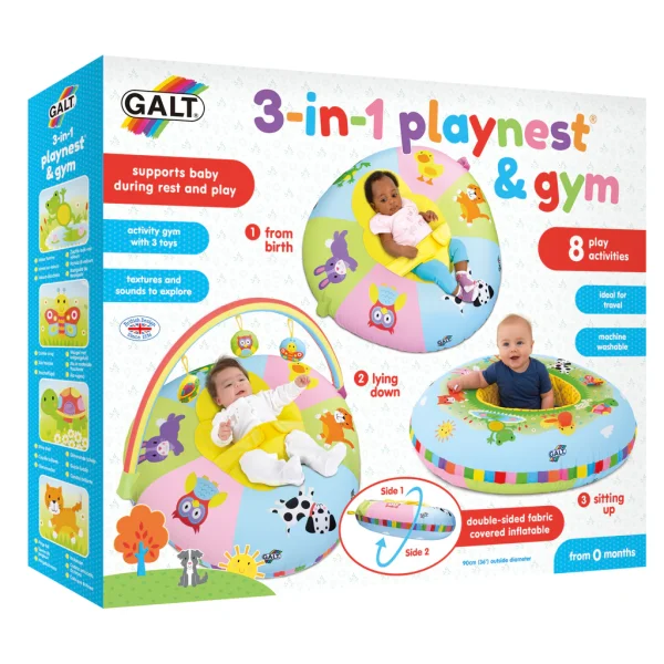 A double-sided Playnest® plus a soft rainbow gym with 3 toys. Supports baby during rest and play from birth, lying down and later sitting up. The soft velour resting area with harness cradles a young baby over the inflatable ring. Add the soft rainbow gym with 3 colourful toys to stimulate baby with bright colours, patterns and sounds. Simply turn the Playnest® over to reveal a padded seating area to support an older baby in a sitting position, enabling them to reach out and explore safely. There are 8 multi-sensory features around the Playnest® to stimulate touch, vision and hearing. Suitable from birth, the 3 in 1 Playnest® & Gym will have an important role in a baby’s physical and play development. The Playnest® cover and gym toys are machine washable. The gym is sponge clean.