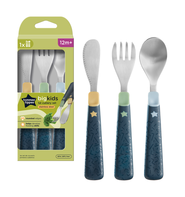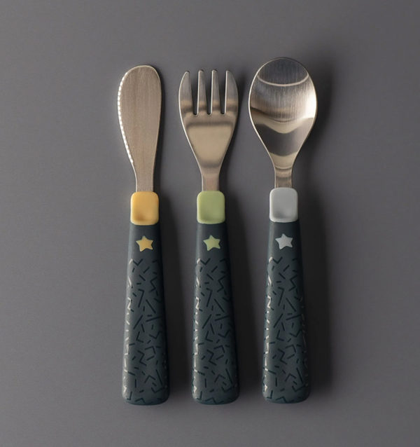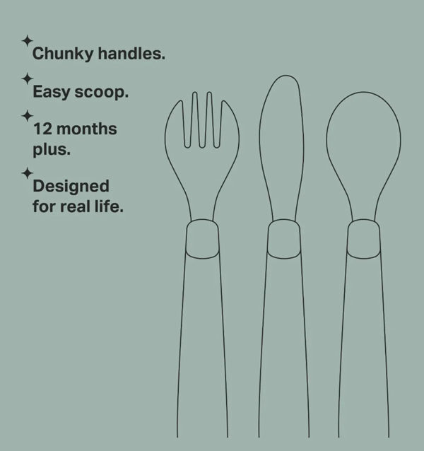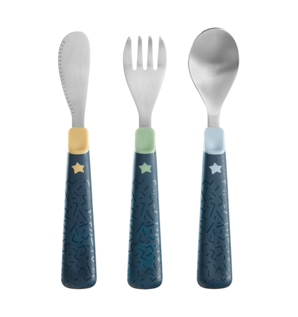 Stainless steel knife, fork and spoon set with bright chunky handles. This set will make your little diner feel like a grown-up at family mealtimes!