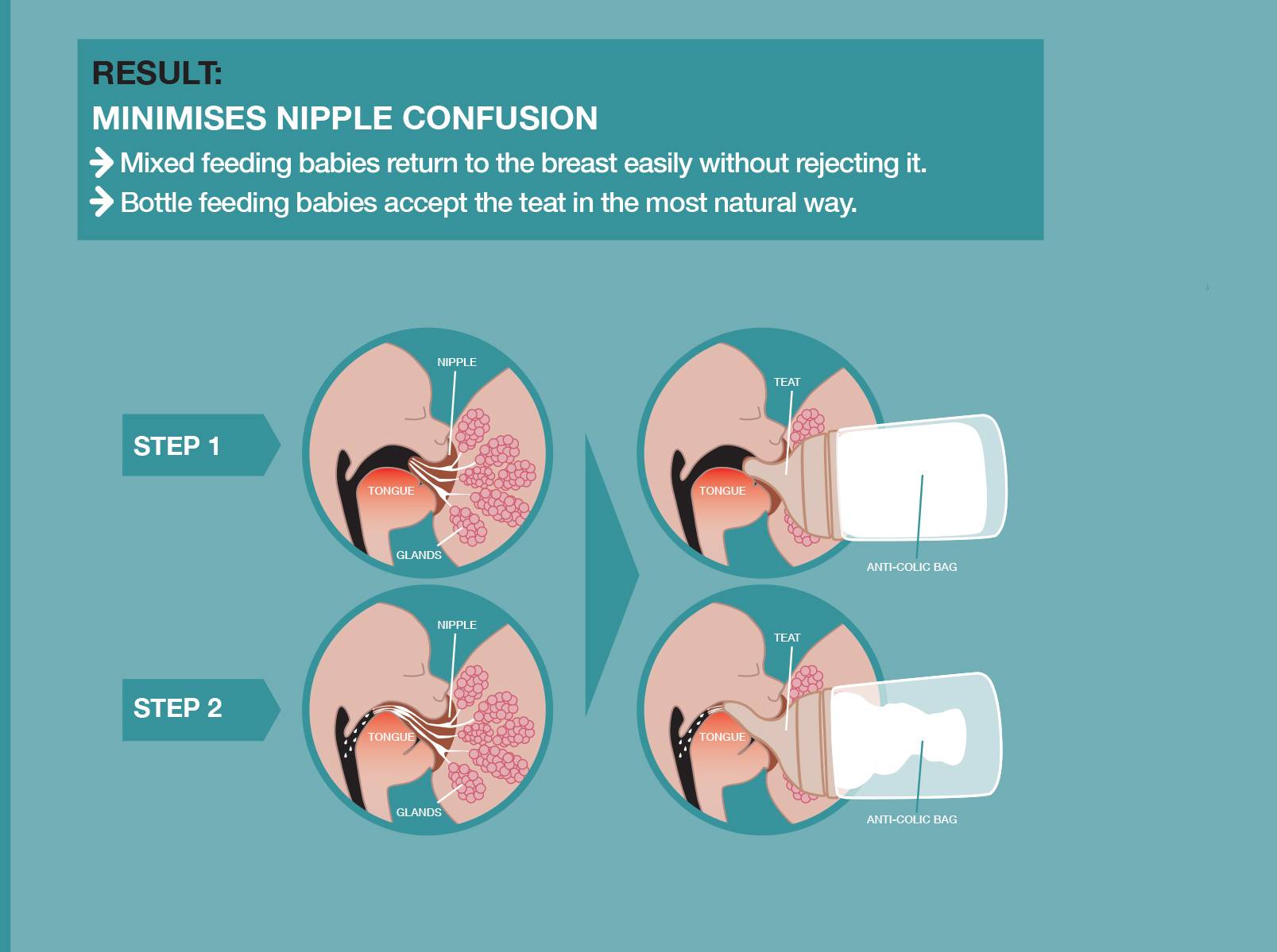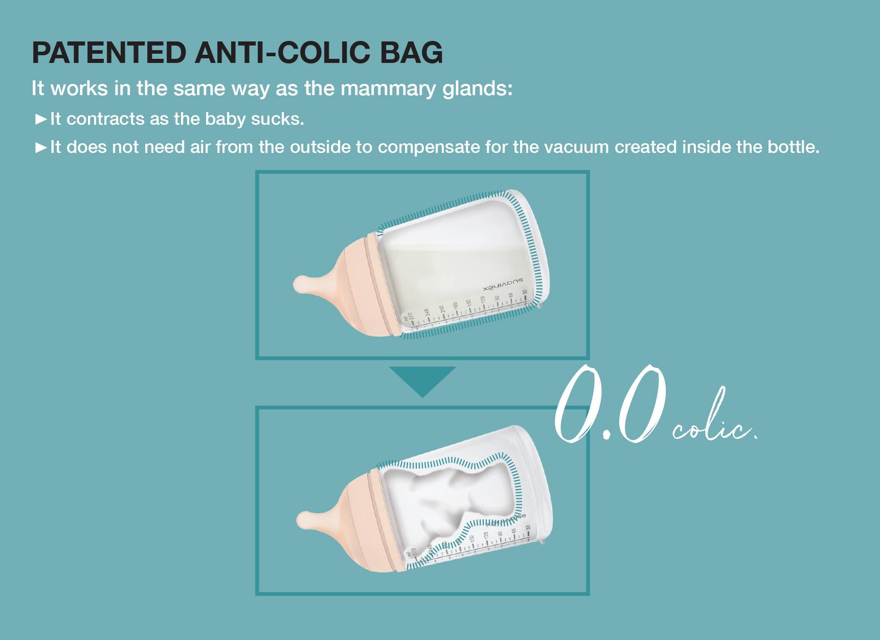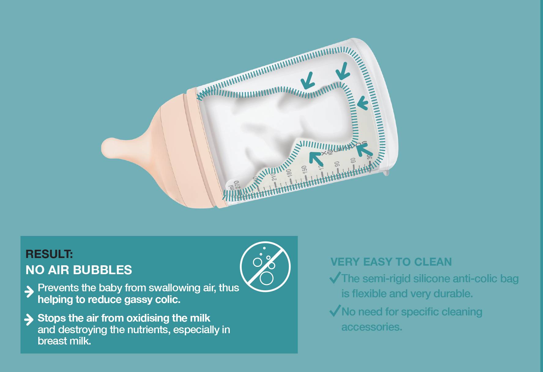 ZERO.ZERO ANTI-COLIC BOTTLETM physiologically The Zerø.Zerø™ bottle mimics the physiology and functionality of the breast and is suitable from the age of 0, for both breast milk and powdered milk. The patented anti-colic bag inside the bottle contracts as the baby sucks, just like the mammary glands. This protects babies from swallowing air, which can cause painful colic. It also prevents the air from oxidising the milk and destroying the nutrients. The zero.zero bottle teat mimics the shape, length and feel of the mother’s nipple, so there is no confusion. This allows mixed-feeding babies to easily return to the breast without rejecting it.