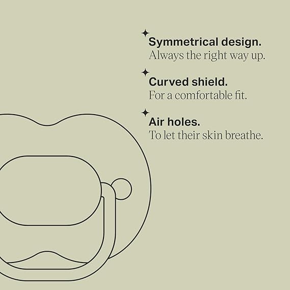 Simple and timeless. The ‘any way up’ soother that’s specially designed to keep them calm. For less stress and more reassurance, anytime, anywhere. • Symmetrical silicone teat (so it always sits the right way up) • Specially designed shield for comfortable fit • Air holes so their skin can breathe • Reusable steriliser pod