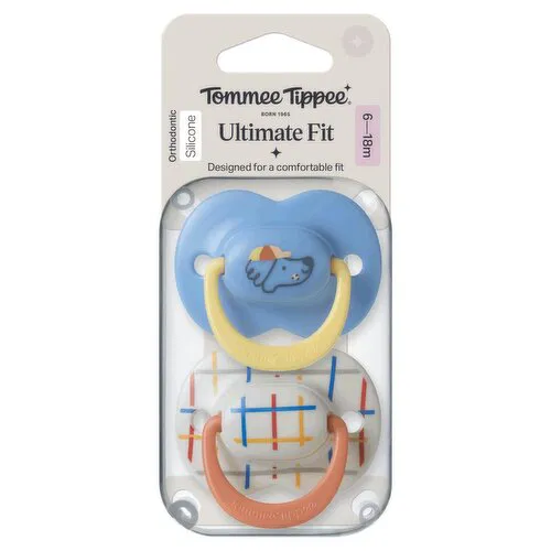 These symmetrical dummies have curved edges and are detailed with holes on either side for enhanced air flow. Shaped for a comfortable fit, any way up, our Ultimate Fit baby soothers are decorated with playful pets, patchwork plaid, and ditsy daisy prints. • 9/10 parents say Tommee Tippee soothers are a perfect fit* • Symmetrical shield and silicone teat that’s the same shape as other Tommee Tippee soothers** • Soother clip compatible handle • Orthodontic dummy, the vented teat compresses to be gentle on developing teeth and gums • Air holes improve air flow and help to reduce moisture build-up and skin irritation • Cool, cute, and colourful designs with fun characters and contrasting touches • Microwave steriliser case, 96% of parents agree Tommee Tippee soothers are easy to clean and sterilise* • BPA-free *Based on an independent survey of 570 parents in the UK and USA with a child aged 0-36 months, currently using a Tommee Tippee soother (October 2025). **Excludes Breast-like and Cherry Latex.
